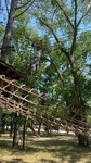 К веревочному парку подошёл со стороны Мойнакского озера по не ухоженной,не эксплуатируемой дороге.Вдруг увидел на повороте на высоком дереве сколоченный шалаш из досок и фанеры.Напомнило это детство, сейчас так не делают.Ну и взбираться туда очень даже высоко.Потом увидел что вся территория огорожена веревками с разноцветными флажками.Все это скрывается под деревьями и даже с перекрестка и остановки трамвая " лиман" не особо и видно.Даже в жаркую погоду здесь комфортно. .