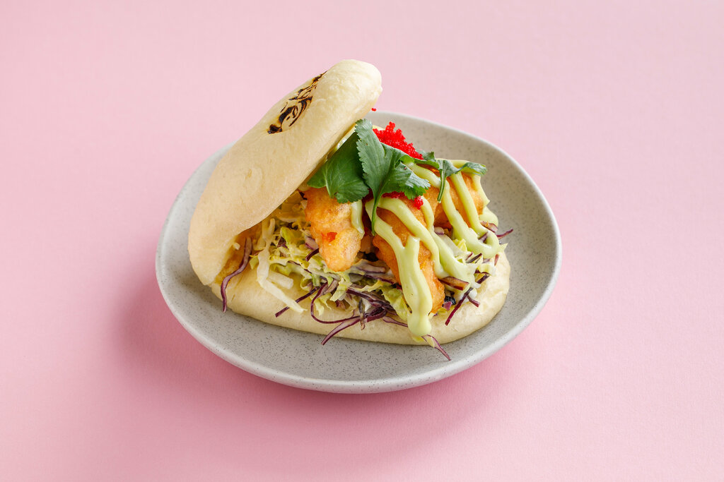 Нежнейшие тигровые креветки в хрустящей темпуре, пикантный сладкий васаби и яркая палитра вкусов — икра тобико, свежая пекинская и краснокочанная капуста, ароматная кинза — всё это заключено в мягкую булочку бао.