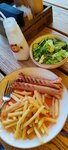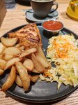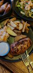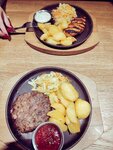Ресторанчик не плохой, обстановка уютная персонал вежливый, подача блюд правильная и во время, заказ ждать не долго. Еда вкусная, но я заказал жаркое из курицы, вроде так называется, картошка и соус вкусные, но курица используется бедро, и оно такое ощущение сюда не подходит, лучше ложить белое мясо грудинку было бы вкуснее, но это моё мнение, не настаиваю.