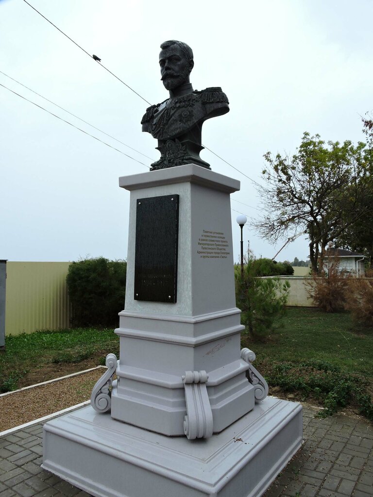Небольшой памятник-бюст императору Николаю 2 установлен у набережной города, выглядит достаточно реалистично, летом неподалеку продаются сувениры, в шаговой доступности храм. Находясь поблизости стоит осмотреть.