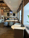 Интерьер уютный, на столах все необходимое плюс сезонноеработает кондиционер, сиденья комфортные, персонал вежлив и опрятен. Кофе латте и эспрессо готовят из одного зерна для эспрессо(кто не знает это который с кислинкой, а для молочных зерна без кислоты)