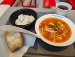 Еда достаточно вкусная, брал обед - вкусный суп и курзе, компот тоже очень вкусный, но обслуживание оставляет желать лучшего. В обеденное время когда большой поток персонал явно не торопится, работа на точке абсолютно не оптимизирована. В итоге они толкаются и мешают друг другу, стоят и болтают с друг другом. Девушка одновременно стоит на кассе и собирает заказ, в одних и тех же перчатках пробивает заказ и берёт деньги и теми же руками собирает ваш заказ. Это явно не гигиенично. Плюс она пробивает несколько заказов, а потом их собирает и люди в очереди стоят ждут пока она соберет предыдущие заказы - явно беда в организации работы точки, но повторюсь еда вкусная.