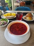 Давно не был, решил заехать пообедать. Летняя веранда работает - это здорово. Взял борщ, картофель с бужениной, салат из свеклы, компот, пару булочек - за всё 850 рублей. Выбираешь всё с раздачи. Цена считаю нормальная для кафе. Всё вкусно приготовленно - поварам большой +. Минус за слабую работу в зале на входе не поздаровались и на выходе не пожелали, не подсказали куда лучше присесть.