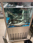 Хороший ассортимент. Неприятная обстановка - запах каких-то солений и скрипящие на весь зал тележки персонала. Рыбам на фото совсем плохо, ведь половина из них валяются мертвые в аквариуме.