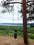В выходной день для фото на качельке нужно было выстоять очередь. Стоило учесть погодные условия заранее, ветер был сильный, девушки когда на качели садились, вскрикивали, потому что страшно становилось. Но какие виды! Кажется даже, что фотография не передаёт всей красоты. Навигатор пешеходов вёл снизу от грушинской поляны, им были трудно по песку подниматься в крутую гору. Тропа есть вдоль железнодородных путей, посмотрите её заранее, если едете на электричке. В лесу интернет был не очень, навигатор не сразу определил нас на карте.