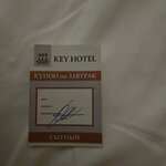 Благодарю команду Key-отеля за возможность прекрасно отдохнуть здесь. Мне очень понравились вежливость, предупредительность и точность Оксаны Короб (надеюсь, правильно помню фамилию), которая меня принимала на ресепшен. Выбрала вашу гостиницу по яндекс.картам и не пожалела - очень удобное расположение в самом центре города, комфортные условия пребывания. Я была в номере 16. На этаже был кулер с водой, кофейный аппарат. Чистота на высоте. Были полезные мелочи: тапочки, уходовые средства. Единственное, что удивило, - это реплика барышни в кафе "Лепим и Варим", куда я пришла на завтрак. Она мне стала задавать вопросы, на что я сказала, что уже указала на ресепшн четверный вариант завтрака (мол, не помню всех деталей). Довольно резковато мне ответили, что до них информация о моем выборе завтрака не доходит. Можно было то же сказать иначе. Присоединяю фотографию завтрака #4