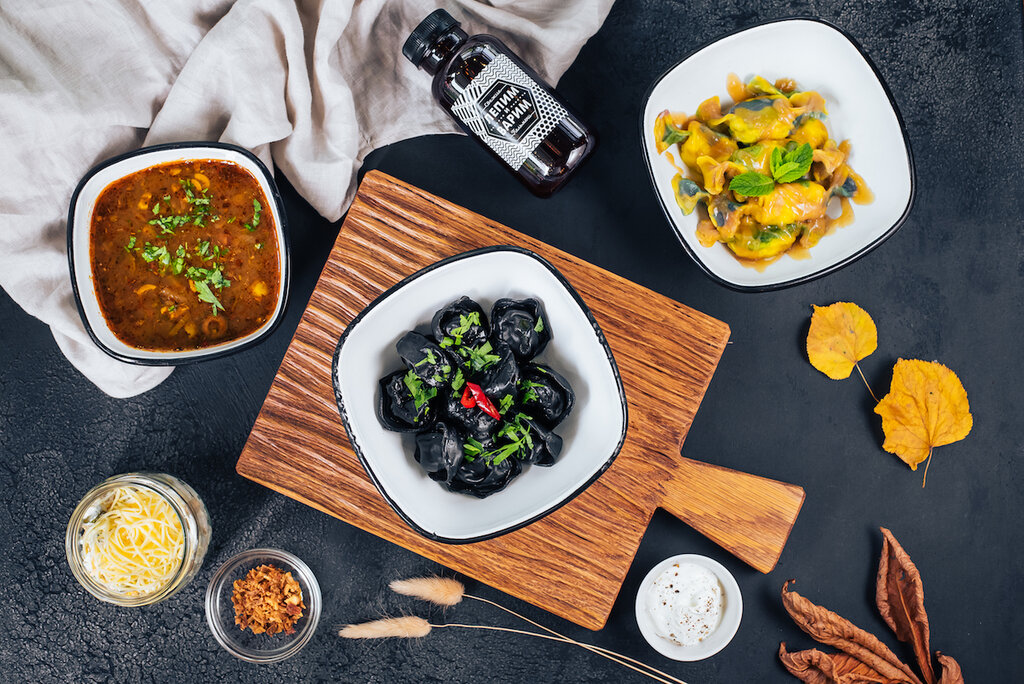 Специально для этих пельменей была придумана технология изготовления двухцветного черно-белого теста, напоминающего окраску быка. А вот с начинкой все гораздо проще – мраморная говядина black angus, соль, перец и немного сливочного масла.