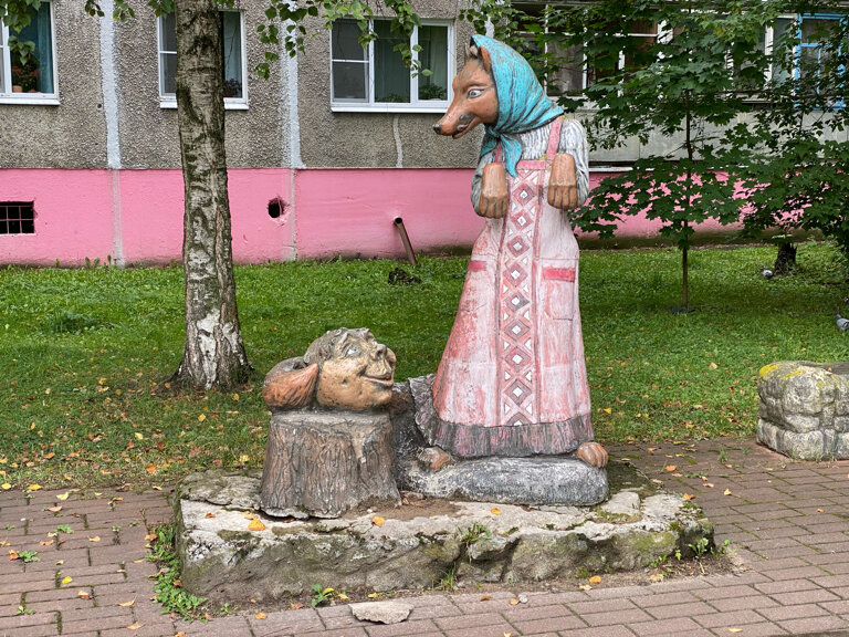 Вдоль всей улицы расположились герои сказок. Медведь, волк, лиса с колобком, заяц, дед и баба... Наверное, из сказки Колобок. Прикольные скульптуры!