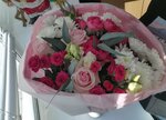 Сегодня утром доставили заказанный букет! Молодцы... Вовремя! Но до места не доехали... Пришлось встречать! Букет замечательный... Очень понравился! Мне кажется, надо поработать над упаковкой... Завернутый в бумагу и закреплённый степлером букет смотрелся не очень, пока мы его не развернули! Благодарю за работу! ☺️😍💯