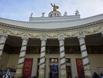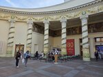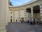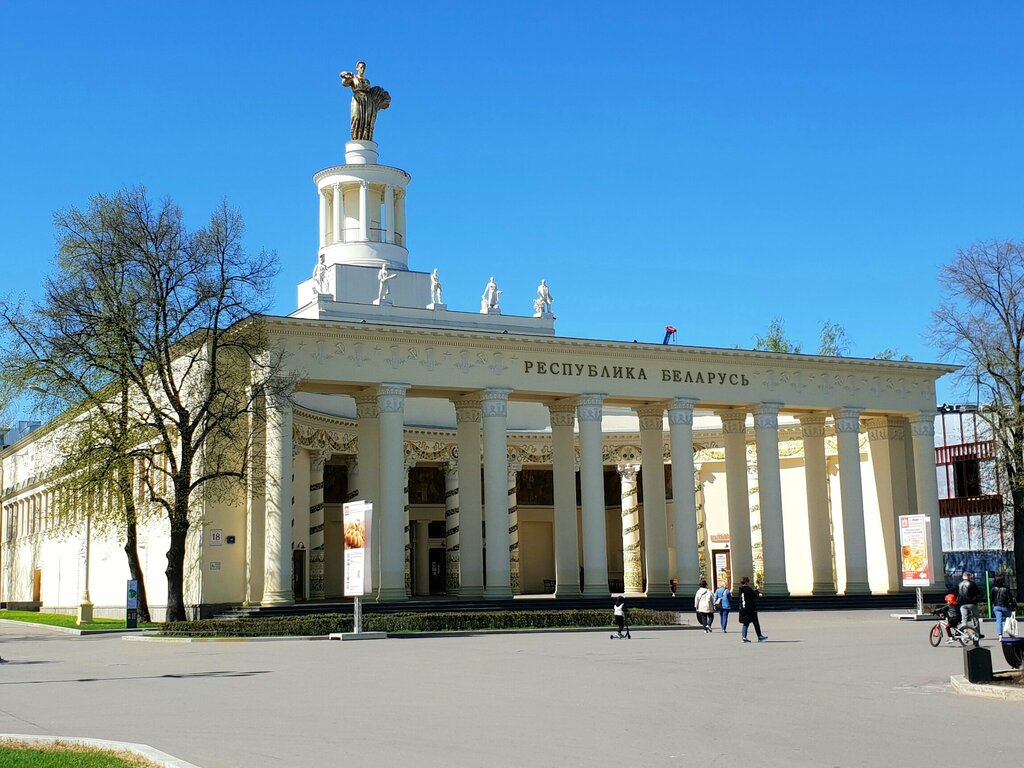 21/09.12:00. Солнечно, +24С. После осмотра Павильона N58 ""УССР", мы плавно переместились в Павильон N18 "Республика Беларусь"( до 1964 года - "Белорусская ССР", в 1964-2008 годах - "Электротехника"). Павильон был построен в 1954 году к открытию ВСХВ, по проекту архитекторов Г.А. Захарова и З.С. Чернышёва. Нам очень импонирует центральный вход "Республики Беларусь", который расположен в лоджии, которой предшествует открытый полукруглый дворик, замкнутый колоннадой-портиком и росписью-фреской по фасаду в верхней части "Народ Белоруссии построил социализм". Внутри павильона проходит постоянная ярмарка белорусских продуктов.