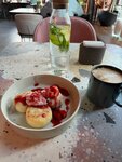 Невероятно эстетичный интерьер. Классное меню, вкусняшечка. Очень хороший кофе, на 5+. Подают водичку с мятой в качестве комплимента. Летом самое то Сырники интересные: шоколад-вишня, вафля-соленая карамель-клубника, а вот к качеству творога вопросики. На мой привередливый вкус он не совсем натуральный