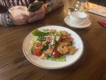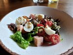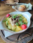 Вкусные блюда и напитки, вежливый персонал, быстрое обслуживание и чистота помещения. В зале присутствует комфортная и популярная музыка, освещение и мебель. На фото — достаточно свежий салат с ветчиной и бэби-картофелем на медово-горчичной заправке.