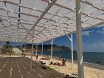 Отличный новый пляж , недалеко от Судака ! Мы доезжали на машине за 10 минут. Аренда лежаков 250 руб час , 600 руб 4 часа , 800 руб целый день. Можно арендовать бунгало , полотенца , сейф . Есть водные развлечения , бар , фудкорт , туалеты, душ , раздевалка . На пляже мелкий- мелкий светлый песочек ,заход в море с камушками , но есть пандус . Народу не много , в отличии от городского пляжа . Но если штормит, то вода мутная. Везде очень чисто !