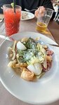 Если честно, впечатление от заведения двоякое. Меню огромное, глаза разбегаются, особенно по барной карте, это однозначный плюс, и напитки действительно очень даже хорошие. Цезарь мне лично не очень понравился, состав не особо классический, но в меню это одно из немногих блюд, где состав не прописан, особенно было бы интересно узнать по поводу мяса, потому что это точно была не просто пожаренная курица, скорее копченая что ли, плюс добавили яйца, я лично придерживаюсь рецепта без них. Паста с креветками и цукини была вкусной. Но вот сервис… Посетили это место в понедельник, внутри практически пусто, помимо нас было занято столика 2-3. Сначала к нам подошел один официант, затем другой, заказ по итогу пробили не совсем верно, вместо двух паст 1. Грязную посуду не убирали со стола ну уж очень долго, но вот времени посидеть поболтать возле бара у официантов было. У нас не спросили, все ли нам понравилось, не извинились за ошибку с пастой. Хостес на входе не особо приветливые. Из-за того, что к нам постоянно подходили разные официанты, им пришлось уточнять где чье блюдо было и при выносе, и при выставлении счета. Честно, это был один из немногих разов, когда я не оставила чаевых – ну просто не за что даже, да и кому, когда в пустом зале вас обслуживают три разных официанта. В общем, напитки 10/10, кухня 7/10, сервис 2/10