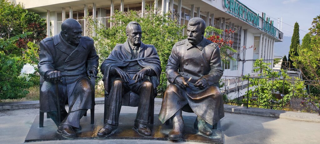 Один из самых известных памятников в Ливадийском дворце, созданном для царской семьи Романовых, и где прошла Ялтинская конференция, в честь которой и был воздвигнут данный монумент. Нельзя просто так взять - и не залезть на колени одного из трех великий людей в мировой истории и не сфотографироваться 😅