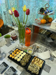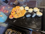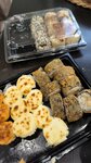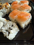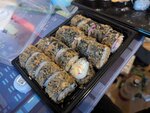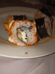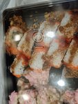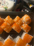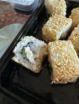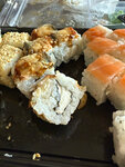 В других заведениях начинок больше и чувствуется морепродукты + имбирь, васаби идёт, здесь положили только соевый соус, и палочек тоже нет. Не совсем запеченые, сверху соуса много.