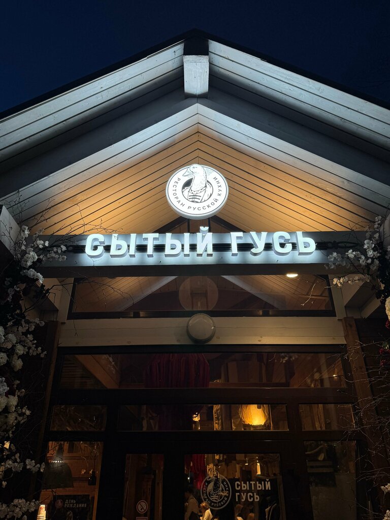 19.07.25г.были в музее народного деревянного зодчества Витославицы.После прогулки решили пообедать в ресторане русской кухне "Сытый гусь".Но боялись,что не попадём, т.к.по отзывам читали,что нужно бронировать столик заранее. Но придя,были приятно удивлены, что места есть.Две улыбчивые девушки на входе подсказывают куда можно сесть.Меню принесли сразу и аж 4 шт.,т.с.каждому)Мы выбрали уху,оливье с бужениной,тёплый салат с говядиной, венигрет с щучьей икрой,пюре с бужениной.Милая девушка -официант (Евгения)от души и на свой вкус посоветовала нам коктейль 🍸. Угодила)))Прям очень вкусный.Точное название не помню,но он вроде первый в списке.Очень приятное место,вкусная еда,вежливое и быстрое обслуживание,приемлемые цены.Нам на двоих вышло 3950(объелись))))Мы с супругом хотели на фоне ресторана сделать фотографию и девушка,что встречает гостей тут же помогла нам и сделала фото.Очень хотелось бы ещё раз побывать в этом уютном местечке.Спасибо всему персоналу за профессионализм.