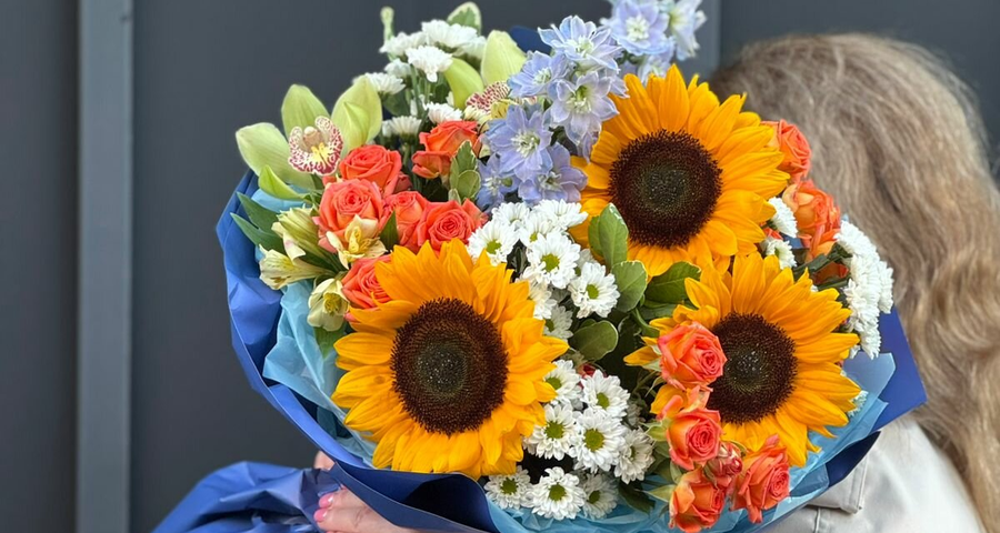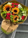Букет с подсолнухами,розами и орхидеями"Кантри"