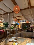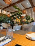 Просторный зал, умиротворяющий интерьер, много зелени, приятная негромкая музыка, расслабляющая атмосфера. Обслуживание на высочайшем уровне. Официант проявлял заботу о нашем удобстве, предугадывая наши желания. Это, наверное, лучший официант в истории. Еда вкусная, приносят быстро. Есть просторная парковка. С удовольствием вернёмся ещё. Вживую ресторан лучше, чем на фото.