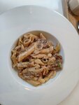 Паста собственного приготовления с обжаренной грудкой цыплёнка и шампиньонами в сливочно-томатном соусе