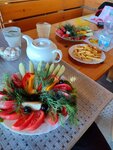 Время честных отзывов! Во-первых: кафе раздает бесплатно пачку чая за отзыв в 5*…. Ну так себе вариант, вместо того, что бы нормально организовать работу, легче купить оценку халявным чаем… Во-вторых: заказывали одно из блюд - «Фаршированные помидоры», не плохо, но «ЖОПКИ» у помидора надо убирать перед подачей! В-третьих: шашлык, ну на любителя… еще и в заказе к мясу был картофель фри, который подали уже когда было все съедено и выпито, хотя ходячие блюда и гарниры надо подавать одновременно, или хотя бы предупреждать, что этот гарнир надо ждать более 20 минут после подачи мяса. И вишенка на торте, зал небольшой около 6-7 столов, официант- одна, которая не справляется с полной посадкой, счет не смогли дождаться, ждали уже на стойке, когда все же посчитают все и длилось это очень долго… так что как место перекусить в дороге, можно, но чек как средне-статистического ресторана, а не у придорожного кафе.