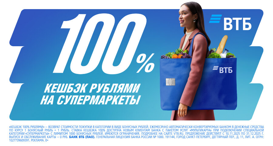 Карта ВТБ. 100% кешбэк на покупки в супермаркетах