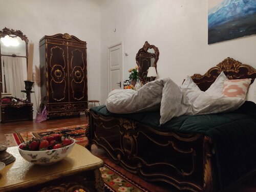 Очень понравился номер, такое погружение в 19 век, мебель, посуда, вазочки, свечи - всё для романтичной атмосферы. Один минус, было зябко. Вероятно такой дом долго прогревается, потому что на улице было очень тепло, а в комнате пришлось включать отопление и всё равно плохо прогрелось, потолки высокие, большой объем.