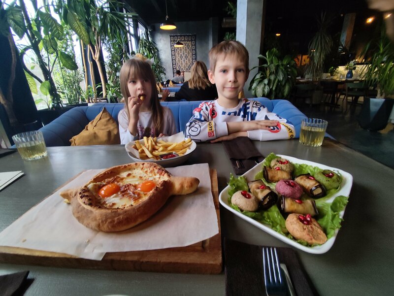 Сегодня обедали с женой и детьми, все очень вкусно . Рекомендую салат с жаренными баклажанами, ребра и кончно хачапури. Еще пиво Натахтари, очень мягкое. На ужин заказали доставку, сидим ждем.