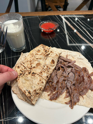 Шикарное место где: 1. Идеальное мясо на огне, как по качеству, так и по прожарке 2. Свой аппарат по изготовлению айрана. По текстуре просто как сливки 3. Чай как комплимент 4. Обращение по имени 5. Самые расторопные официанты, что я видел в Алматы 6. Цена полностью соответсвуюет качеству, нет оверпрайса, свойственного таким местам
