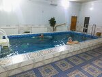 Огромный бассейн. Просторная парилка, новое дерево. 2 комнаты отдыха большие. Холодильник, посуда, полотенца все есть. Компанией из 8-10 человек легко поместились, просторно