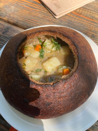 Хочу дать обратную связь про качество блюд - заказала зеленый борщ за 390 р Принесли тарелку размером со стакан , внутри одна картошка , хлеб сюда не положен ,заказала гороховый суп в надежде поест все таки - принесли булку хлеба внутри картошка , !!!!!!!!-язык принесли тонко тонко нарезанный и невкусный , цена вопроса 1210 р - че к чему - Вобщем резюме - дорого и невкусно - больше не приеду , раньше гороховый суп был гороховым , а не картофельным и он вообще был , принесли булку хлеба - внутри чуть выемка и картошка - не стала есть- кухня ни о чем - язык чуть чувствуется пропал - если не отравлюсь от этой кухни - будет счастье - больше не остановлюсь НИКОГДА !!! Что с ними произошло ?!? Зажрались