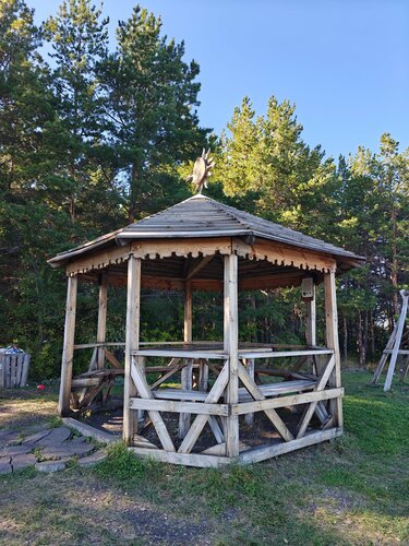 Место шикарное и очень удобное для отдыха и любования красотой этого места - Виды просто шикарные!!! Рядом хороший лес, по которому классно прогуляться, хотя с полянки, на которой стоит беседка, совсем не хочется уходить! В беседке удобный стол, рядом есть лавочка с удобным расположением ( с неё очень хороший обзор) и ещё одна лавочка у леса, в тени - в жаркую погоду очень кстати. Классные качели рядом с беседкой, но , к сожалению, оторвалась сидушка. Подъëм к беседке изначально более пологий, но чем выше, тем круче, там нужно быть осторожнее.