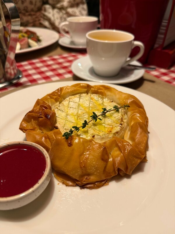 Зашли в итальянскую тратторию вечером перед театром легко перекусить. Заказала камамбер в тесте фило с малиновым соусом и пряный облепиховый чай с грушей. Все было вкусно!
