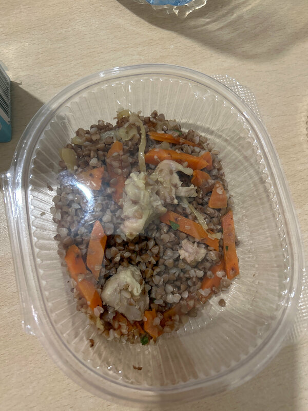 Качество еды среднее, зависит от смены, как мне показалось. Прилагаю фото гречки с «курицей», никому не кажется это смешным?)