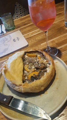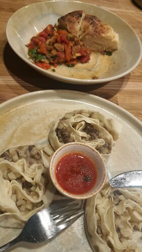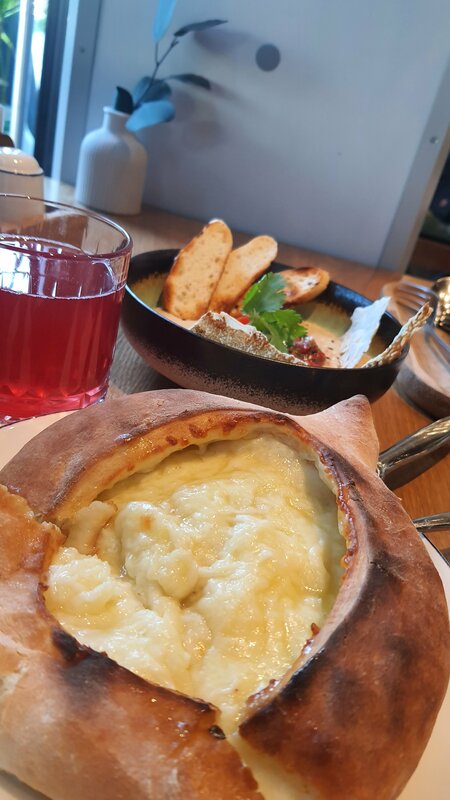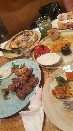 Очень вкусный хачапури по-аджарски! Хотелось именно это блюдо и оказалась очень доволна! Сочный, много сыра, отличное тесто! Увидела на картинке на сайте хумус с овощной сальсой, почему-то его захотелось и не зря. Хумус просто потрясающий, самый вкусный из всех, которые пробовала в заведениях! Обслуживание, чистота, музыка и мягкое удобное кресло! В восторге от этого заведения! Следующий раз буду пробовать шашлык, кажется, что он может быть, ну огонь🙂