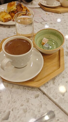 Самый честный отзыв Зашли перекусить Взяли 2 комплекта (слоёное тесто с сыром, лодочки с мясом и турецкий кофе) За всё 700 лир. Оплачивали местной валютой. Всё вкусно. К тому же всё нарезали, разложили по тарелочка. Наелись и получили гастрономический удовольствие Никто не обсчитал. Спокойно посидели. Обслуживание быстрое.
