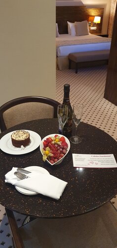 Бронировали Клубный корпус Джуниор Люкс. У меня был День Рождения. Со мной заранее списалась менеджер по бронированию Елена, всё расспросила и ответила на все интересующие меня вопросы! По приезду нам дали номер и учли все наши пожелания, которые я просила учесть при бронировании. Номер был чистым, вид из окна потрясающий! Этаж, как и просили, высокий. К нашему приезду уже был накрыт стол с фруктами, пирожным и бутылкой шампанского. Персонал на ресепшен был мегаотзывчивый. И в одну, и в другую смену! Помогли мужу оперативно решить проблему по доставке украшения в номер в виде шаров. В день рождения (на следующий день после заселения) меня неоднократно поздравил персонал отеля, а когда мы вернулись с прогулки, в номере ждал небольшой сюрприз в виде пакетика с ещё одной открыткой, бутылочкой вина и шоколадкой. Единственный минус, который я для себя отметила, это реально очень плохая звукоизоляция. В соседнем номере был девичник. Сначала меня это абсолютно не напрягало, но когда я проснулась под песни девчонок в 4 утра, пришлось сходить и попросить их быть потише. Отель и правда очень красивый! Нашей семье всё очень понравилось. Завтраки, действительно, видели и больше и лучше, но лично нам больше не нужно. Всё необходимое, что мы привыкли есть на завтрак, было.