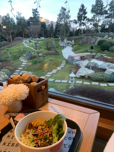 Еда ,порции маленькие , но атмосферно интересный интерьер . Чисто , вкусно. Ассортимент блюд не большой, это минус.Расположение хорошее с видом на японский садик. Персонал приветливый . Есть настольные игры в ожидании скоротать время. Уютно, вкусно , атмосферно. Стоит посетить .