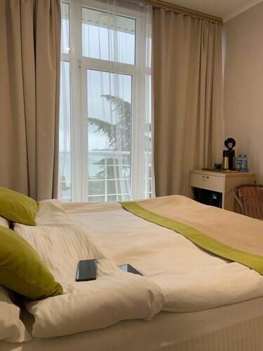 Были с семьей на Новогодних праздниках. У нас было два номера двух местных один с видом на море , другой на горы. Вид на море отличный . Номера просторные светлые, тёплые . В номере гигиенические принадлежности есть , кухонный уголок чайник , тарелки , чашки . На первом этаже бассейн крытый с тёплой водой и сауна. Отличное расположения от набережной в шаговой доступности. Магазины, кафе и инфраструктура все рядом. Нам отдых понравился . Хорошо провели время.