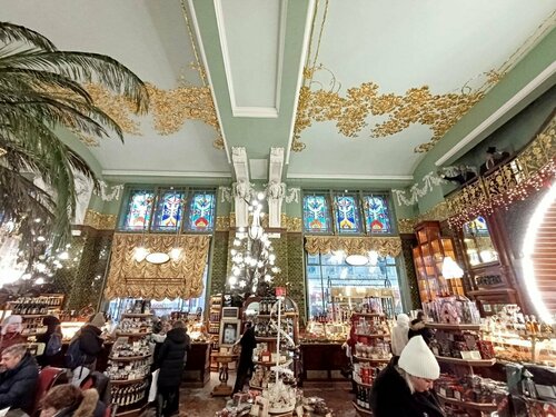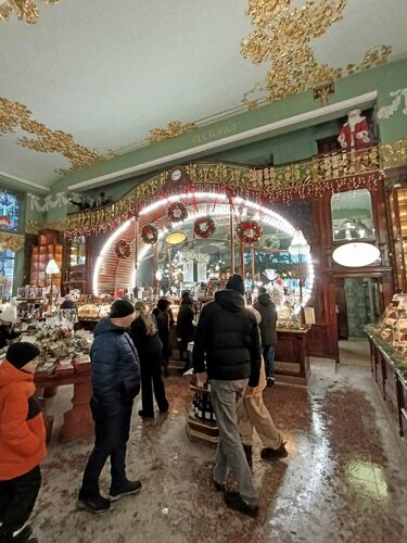 Не знаю почему, но сколько раз приезжали в Питер, видели этот магазин только с улицы. А тут гуляли по Невскому и решили зайти. Ну что сказать - ДОРОГО и БОГАТО! Всё очень красивое и помпезное. Ассортимент продукции огромный, но очень дорогой. Замечательное механическое пианино добавляет некий шарм в обстановку, а толпа создает атмосферу, что кажется крутани на лет сто назад кроме современной одежды ничего не поменяется. Гостям Северной столицы очень рекомендую этот магазин к посещению. Кстати там в подвале ресторанчик есть, правда я там не был, но думаю в следующий раз как буду в Питере надо заглянуть. А вообще спасибо тем, кто вернул кусочек истории города и создал гостям необыкновенные ощущения сказки.
