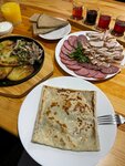 Обедали два раза. Подают чебуреки XXL на деревянном подносе. Одного такого чебурека достаточно для обеда)) В целом понравилось кафе, но есть одно замечание - подавать блюда нужно одновременно для всех гостей) А то кто-то ест, а кто-то смотрит) И все равно 5 звезд, готовят вкусно и не дорого. К борщу подали рюмку водки и хлеб с салом. Приятно. Но был за рулём - пришлось отказаться. Подъезд удобный на машине, рядом парковка. Транспорт в пешей доступности. Принимают карты. Рекомендую 👍🏾
