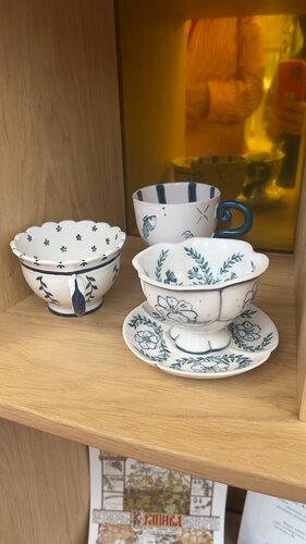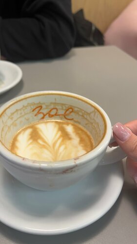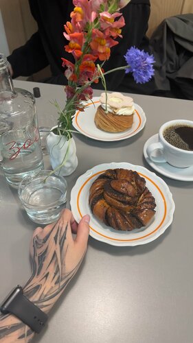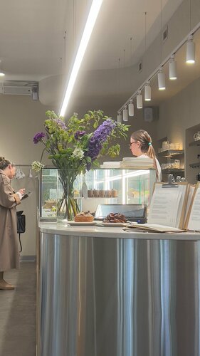 интерьер супер, очень уютно, небольшое пространство, теплый свет, свежие цветы. кофе вкусный, я брала латте с корицей. посуда приятная на ощупь, ручной работы. но вот булочка полная печаль, невкусно, даже не захотелось доедать-брала булку с маком, к ней еще подали максимально безвкусное сливочное масло