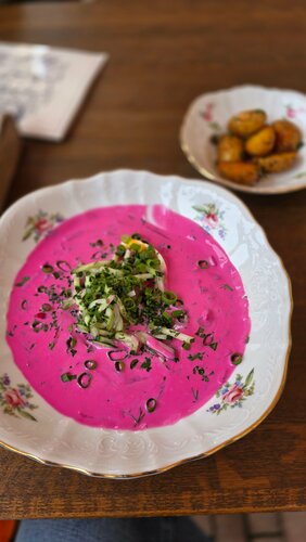 Было вкусно, но долго готовили еду. Ели холодник. Супер супчик! В кафе несколько этажей, есть лифт. На этажах висят красивые картины