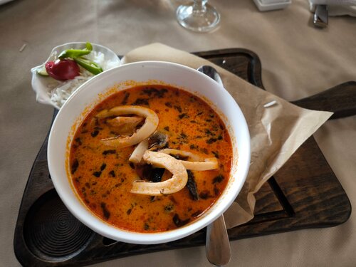 При всем уважении к создателю и истории этого заведения, осталась загадкой, причина столь высокой оценки: ресторан очень плох. По порядку: -⭐ лицо ресторана: пафосная хостес с темными длинными волосами и широким лицом на мое "Здравствуйте" ответила: "у нас депозитная система, 1500 р - минимальный заказ на человека, будете садиться"? Я привык к манере общения большинства местных, но для самого известного ресторана Абхазии, это было крайне негостеприимно, некрасиво и просто противно, было желание развернуться и уйти. Странно, что не просят показать сначала деньги) -⭐ кухня: картошка в оливье не доварена; том ям за 880р без половины ингредиентов, но с резиновым кальмаром и одной креветкой не годится в подмётки аналогу из любого тайского стритфуда; в куринной лапше почти только один бульон; единственный доступный из лимонадов, якобы домашний лимонад за 800 р на вкус - будто разбодяжили апельсиновый сок из пакета. Намазали для красоты на тарелку с оливье зигзаг наршараба) -⭐ официант принесла блюда и больше мы ее не видели: посуду никто не уносил, как у нас дела не интересовался, даже счет пришлось просить у другого официанта. Видимо ребята расслаблены, т.к. 10% уже включены в счет, а большего не надо. -⭐ при нас устроили поздравление с ДР на сцене для своей управляющей или вроде того: сбежались все сотрудники с телефонами - подпевали, хлопали и снимали эту вакханалию. Могу описать это, как некую смесь детского утренника и междусобойчика в бухгалтерии. Испытал диссонанс показного пафоса заведения и истинной местечковости персонала, работающего в нем) Вот зачем мне, как гостю, на это смотреть? Я пришел вкусно поесть, а не испытывать стыд, что это происходит при мне) Резюме: ресторан повидал много событий и знаменитых персон, в разные годы менял свой формат, но сейчас скатился до дна, делать как в ресторане, здесь решительно нечего: еда невкусная, сервис отвратительный. Не ходите сюда, может тогда администрация наведет порядок с персоналом, сервисом и кухней.