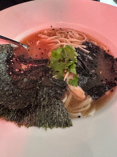 Были в субботу вечером, нам повезло были свободные столики и мы сами выбрали, где сесть. Но к концу нашего ужина в дверях стояла очередь!!! Брали рамен, мидии в сырном соусе и горячий микс из морепродуктов. Рамен не понравился, все остальное вкусно. Заказ на кассе неудобен, зачем, если доп заказы все равно через официанта?!! Можно было бы сразу делать заказ через него. Интерьер симпатичный. Но снизила оценку из за того, что официантка чуть ли не забрала еще недоеденное блюда, спеша нас рассчитать и посадить за наш стол очередных гостей… считаю такое недопустимо