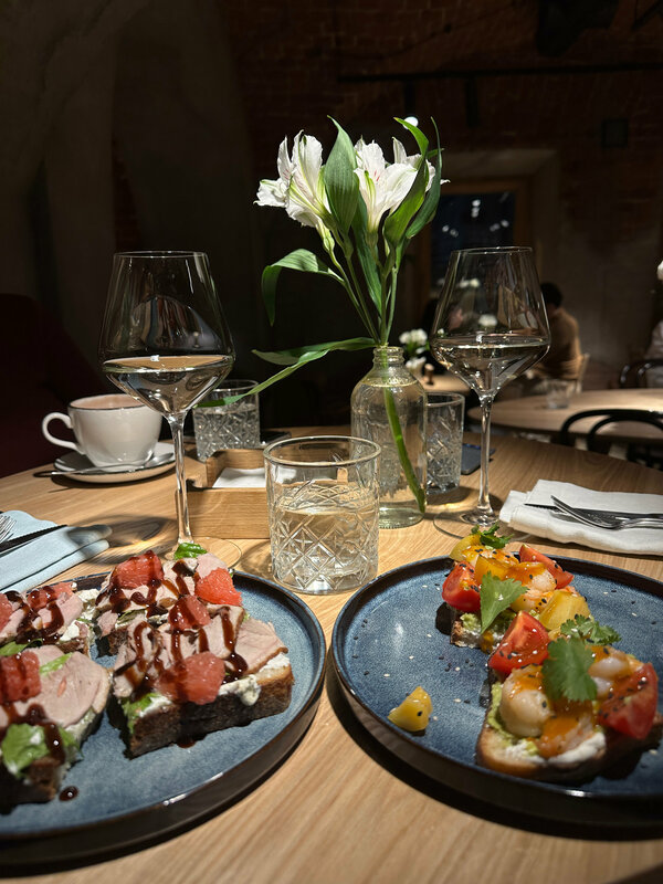 Очень уютное место, персонал производит прекрасное впечатление своей заботой и внимательностью к гостям! Очень понравилась брускетта с копченой уткой, с лососем не особо даже произвел впечатление) Прекрасно начали вечер с бокала Рислинга!