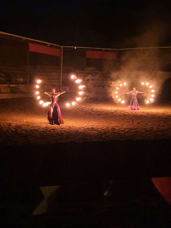 Ходили на вечернее представление. Не могли понять почему рыцарский турнир так поздно по времени начинается. Но уже в процессе представления поняли. Помимо рыцарей, лошадей, трюков, прекрасное фаер-шоу.