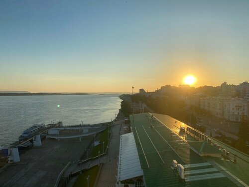 Жили там 3 ночи. Здание постройки СССР, но недавно был ремонт. Полу-люкс 2 комнаты. Двух спальная кровать, кресло и раскладной диван не убитые из качественной экокожи все норм. Душевая кабина совсем маленькая. Мыться не удобно. Полотенца, халаты, тапочки, мыльные принадлежности все есть. Кондиционер спасал в жару. Но все претензии уходят на второй план когда смотришь в окна. Одни большие окна выходили на набережную, вторые на речной причал. Кораблики большие и малые, метеоры, моторные лодки, баржи-сухогрузы весело ходили по Волге туда-сюда. Спускаешься вниз, купил билетик и на кораблик. Или если хочешь погулять и позагорать идешь вдоль песчаного пляжа километров 5 и выбираешь место. Ресторан оценить не удалось, ели каждый день в разных местах. Их в Самаре на каждом углу как Комаров в лесу.