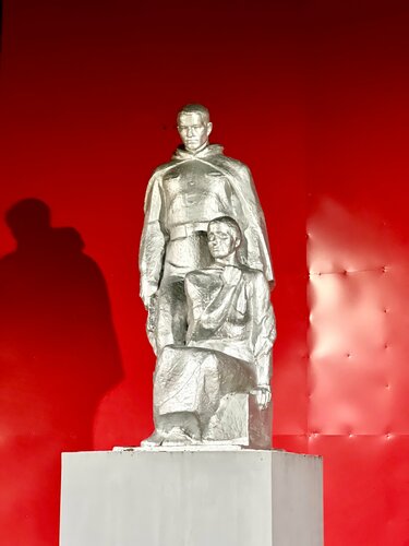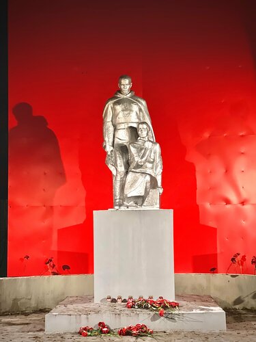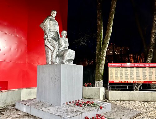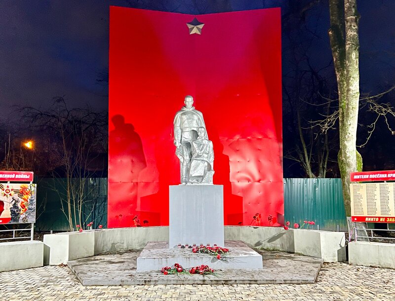 Памятник располагается на одной из самых известных улиц Красной Поляны - Текстильной и посвящен жителям данного района (и не только), которые работали на хлопкопрядильной фабрике Крестовниковых и отдали свои жизни за Родину, отправившись на фронт в годы ВОВ. Вид у него строгий, как и у многих типовых памятников, несмотря на то, что красный фон смотрится достаточно динамично за спинами двух застывших фигур и придает сюжету больше трагизма. Пройти мимо невозможно. Цветы и лампады так и призывают подойти ближе и прочесть фамилии тех, кого следует помнить…