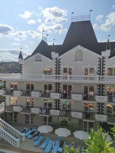 Были впервые. Из плюсов: сам объект выдержан в тематике замка. Выглядит хорошо; анимация лучшая из того, что мы видели в Крыму, за счёт приглашенных групп или артистов; ребята на шведке работают отлично! Просто факты: еда стандартная, как у всех. Из фишек - повар вечером выкатывает какое-нибудь блюдо от шефа. Минусы: 1) по акции полная предоплата и при отказе менее чем за 30 суток взымается плата за первые сутки (у нас это была сумма в 27 тыс - как-то жирновато за то, что люди так заранее сообщат об отказе) 2) заказывали номер на 3 взрослых + 1 ребенок 13 лет, по факту в номере 2 халата взрослых и 2 на детей лет до 8, в холодильнике плесень и комнату нужно очень проветривать от такого же запаха; 3) ехали по сути на теплый бассейн (на это повелись, так как июнь и море ещё не располагает к купанию), по факту попали на воду температурой 26-27 градусов (смотрела по термометру в бассейне) и мне,как не плавающему гостю, купаться было можно только на пятачке для детей - вся остальная территория бассейна очень глубока доя моих 167 см. 4) музыка очень громко включается в 10 утра на зарядку и до 10 вечера без перерыва! Очень громко и даже при закрытых дверях с трудом слышно телевизор в обычном режиме. Сидя в обеденной зоне невозможно поговорить так как приходится наклоняться к человеку и орать на ухо! Очень бы хотелось паузы хотя бы в обеденный период. 5) на всех жильцов чуть больше 20 шезлонгов у бассейна и поэтому народ живёт по принципу "кто успел утром кинуть полотенце на лежак, тот и загорает". 6) система "ультра все включено" как заявлено на сайте отеля, на самом деле включает еду фудзоны и напитки из бара, но только из дозволенного списка - два вида вина, утром шампанское, три коктейля, лимонад и сок. Ребенку мохито или колу только за доп оплату! ( 54 тысячи с копейками за две ночи). 7) при заселении возник вопрос с оплатой (попросили доплатить ещё 3,800 , хотя у нас была полная предоплата). Хорошо, что взяла с собой лист бронирования. Вопрос, конечно, выяснили, но неприятно. Итог: не накупались, голодными не были, посмотрели два отличных представления по вечерам; уезжаем с мыслью, что ещё раз не приедем - конкуренты в двухстах метрах со стоимостью немногим выше победили однозначно! Владельцам : делайте что-то с купальной зоной - она у вас не выполняет свои функции (поэтому на фото зона бассейна безлюдная), а поесть за такую стоимость и попить у вас нечего. Если бы не группа "Фиеста" и умницы семья цыркачей "Лотос", то можно было бы съезжать уже в вечер заезда.